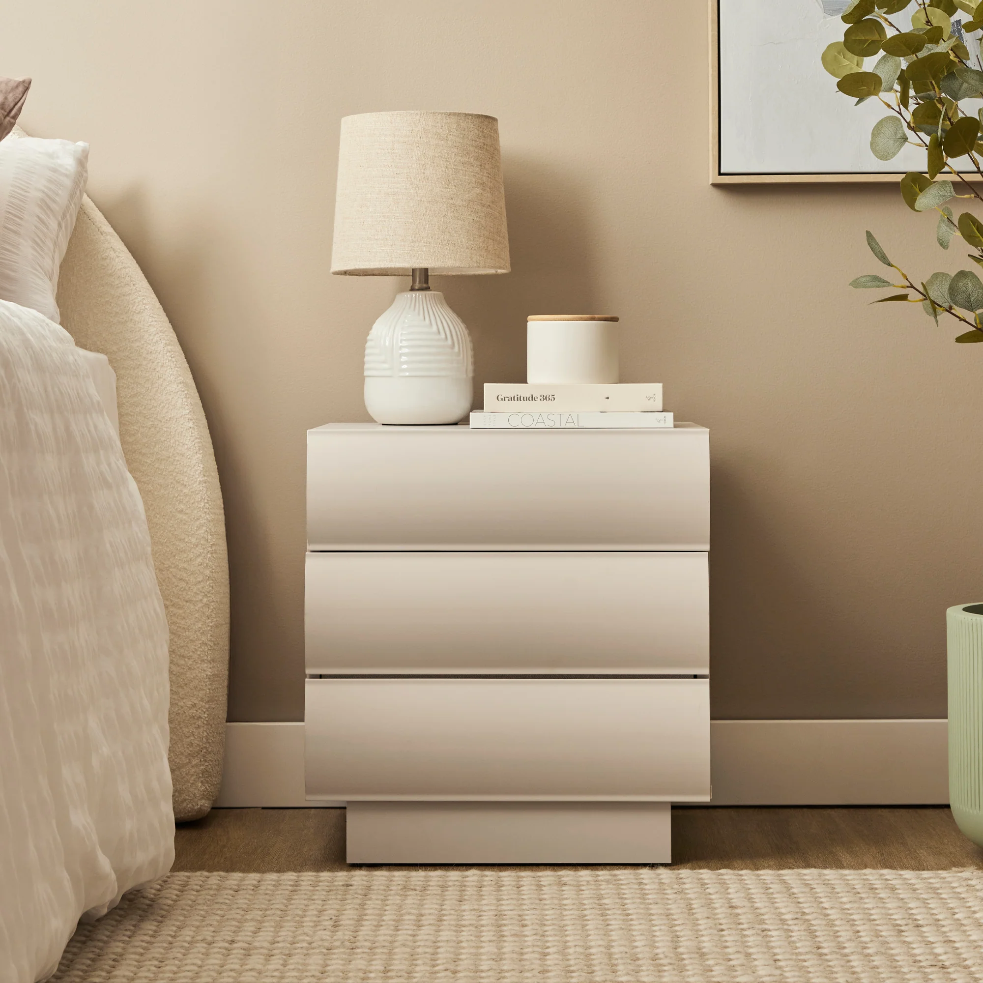 The Cooper & Co. Elsene 48cm Bedside Table Grey is a stylish and practical addition to your bedroom, featuring a clean, modern design with a Grey finish. Crafted for both function and aesthetics, this bedside table offers convenient storage with smooth, push-to-open drawers that enhance its minimalist appeal. Its compact design makes it perfect for bedrooms of all sizes, adding warmth and practicality to your space.